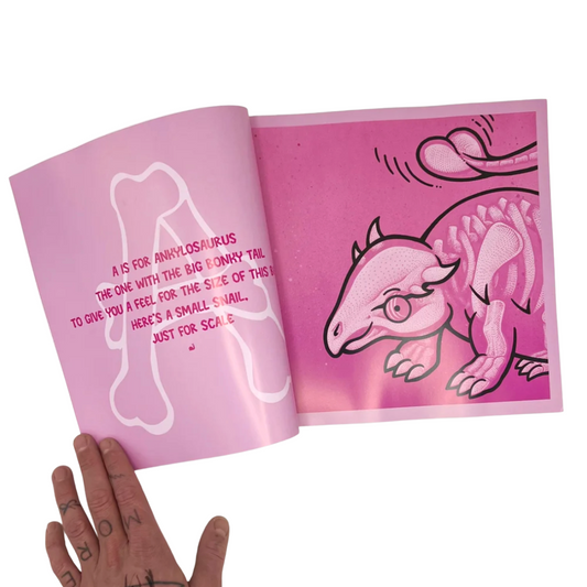 ‘The A-Z of Dinosaur Bones’ is a vibrant collection of 26 hand-drawn illustrations of dinosaurs (and their bones)! Along with an educational rhyme to accompany, created by contemporary artist Will Blood.